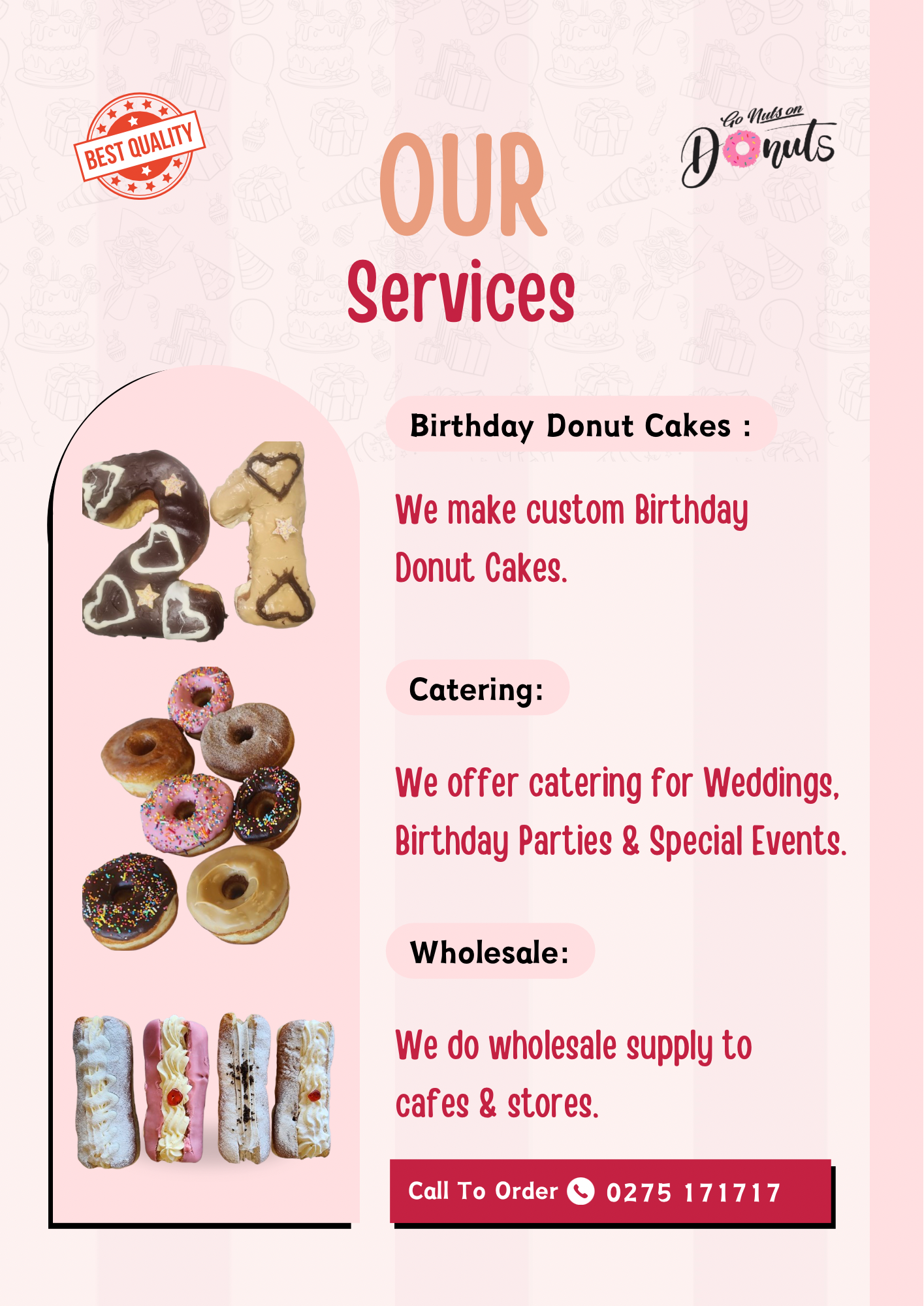 For birthday cakes, wholesale orders, or event catering, contact us at order@gonutsondonuts.co.nz or call +64 027 517 1717.